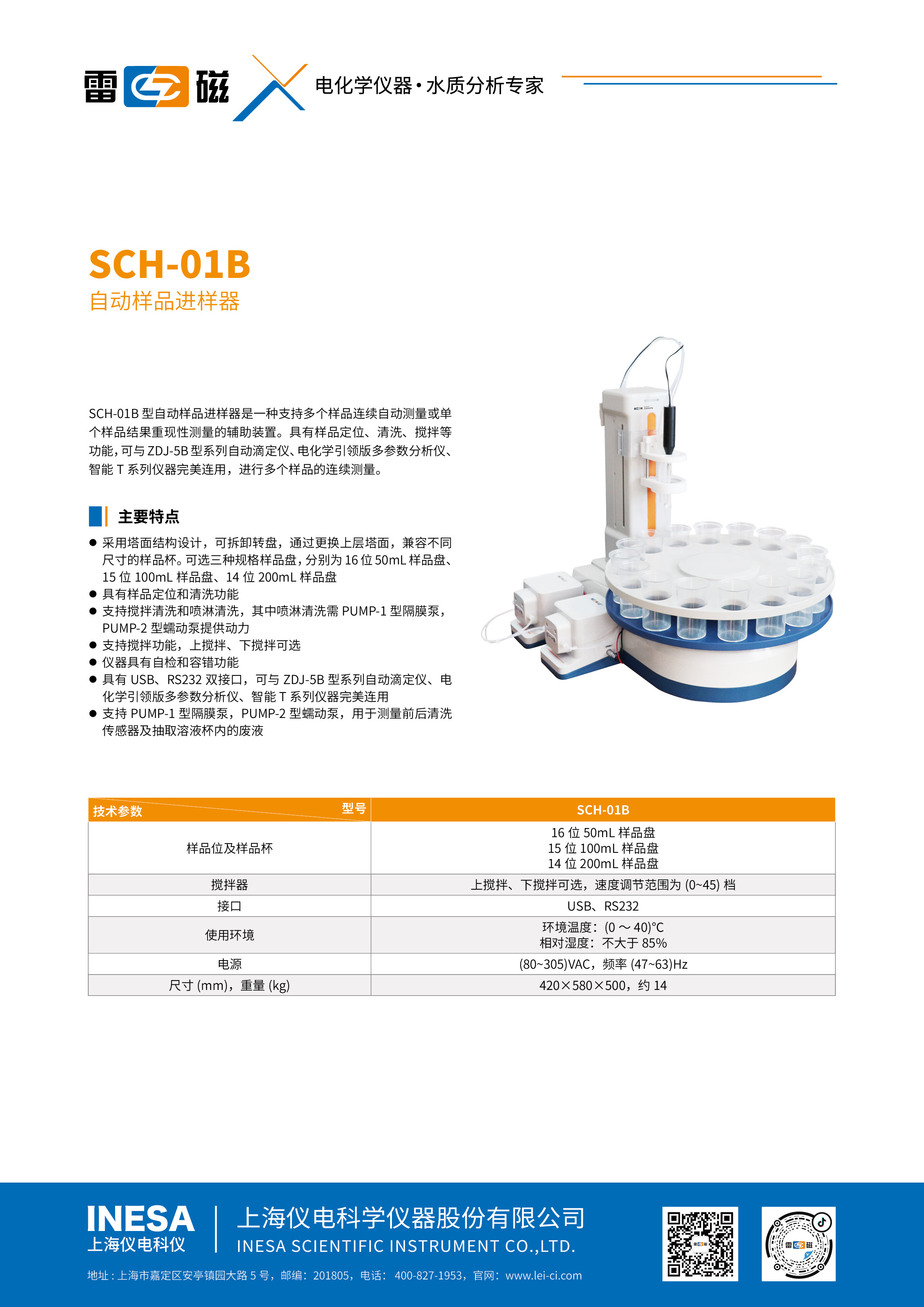 SCH-01B型自动样品进样器是一种支持多个样品连续自动测量或单个样品结果重现性测量的辅助装置。具有样品定位、清洗、搅拌等功能,可与ZDJ-5B型系列自动滴定仪、电化学引领版多参数分析仪、智能T系列仪器完美连用,进行多个样品的连续测量。